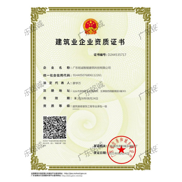 廣東銘誠智能建筑科技有限公司成立于2008年,公司注冊資金為6000萬元,集辦公裝修、酒店裝修、家庭裝修、軟裝裝飾、娛樂場所裝修為一體的裝飾公司,率先提出“創造現代人文空間,挑戰業界高峰”的雄壯口號,并以此為目標,完成了一大批具有影響力的大型公裝工程:其中包括廣州國際中醫藥展貿中心、奧飛澄海音樂廳、澄海區國家稅務局、澄海興信小額貸款、澄海潮商村鎮銀行、汕頭龍湖賓館、澄海豪庭大酒店、御園國際飲食城、澄海福晉軒酒家、享樂匯保健有限公司、假日商務酒店、尚景康園物業、星輝車模股份有限公司、奧飛動漫有限公司、香港國際玩具、汕頭萬基貿易有限公司、泰興源實業有限公司、汕頭皇冠玩具有限公司等;家裝工程包括南澳黃金海岸整幢的精裝房、中信華府、富春華庭、金信鳳凰名城、凱旋花園、中信金城、柏嘉半島、陽光海岸、金葉島等高等住宅。 ? 廣東銘誠智能建筑科技有限公司經過十余年的建筑裝飾裝修施工領域項目積淀,于2018年2月取得“建筑裝修裝飾工程專業承包二級”、“建筑機電安裝工程專業承包三級”、“建筑工程施工總承包三級”、“施工勞務不分等級”、“安全生產許可證”等專業資質,并于2021年8月建筑裝修資質正式升級為“建筑裝修裝飾工程專業承包一級”。這是對企業規模、工程業績、管理水平、誠信表現的肯定,是企業實力與能力的展現。 ? 公司每一項工程都始終堅持“精美設計、精心施工、確保合同承諾;勤奮開拓、追求突出、創造時代精品”的質量方針,力爭做一項工程,樹一座豐碑。 ? ?銘誠擁有一支由專業的營銷精英和客戶顧問組成的營銷隊伍,勤奮、敬業的每一位銘誠員工將本著“贏在別人休息時”的專業精神,為客戶提供全程營銷及售后服務,確保客戶的合法利益,提供體貼周到的服務,做到讓顧客滿意。 ? 銘誠擁有一批資老牌室內環境設計師,以“現代人文空間”為設計理念,為客戶提供人性化、差異化、智能化的室內環境設計服務,準確的將人性化特點與室內環境相融合,達到了“現代人文空間”的和諧統一。 ? ? ? ?自主創新、視社會責任為己任的精神使我們在發展的道路上屢獲殊榮:不斷提升的銘誠品牌知名度和美譽度,靠的是優質的產品,靠的是不斷提升的營業績,靠的是國內的核心技術和誠信的服務。相信通過銘誠人的努力,銘誠將會不斷以新的姿態為提升廣大消費者的生活質量做好服務,為中國裝飾行業設計創新做出突出貢獻。 ? ? “忘掉競爭、共